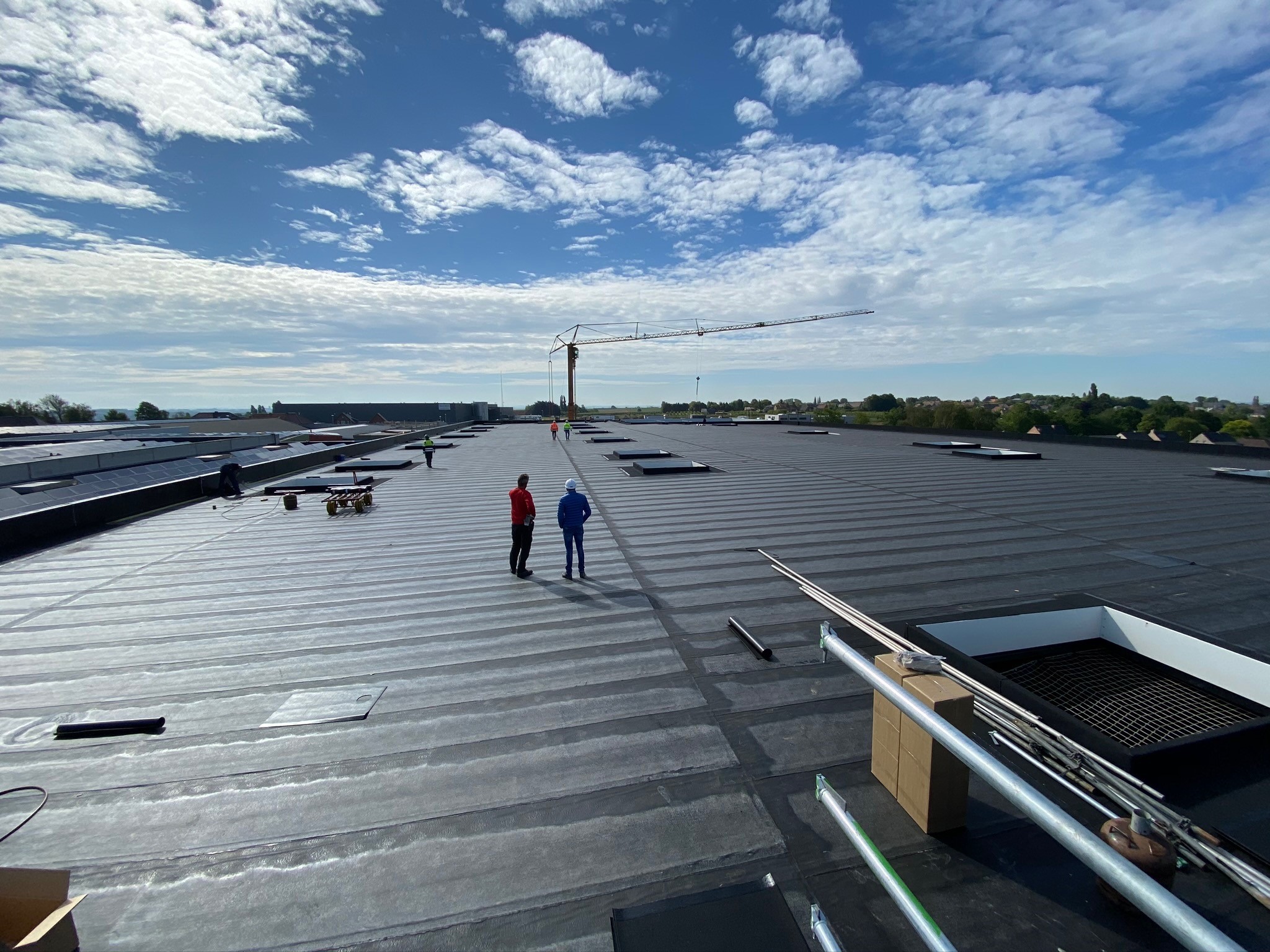 L'architecte Gregory Nijs (Klaarchitectuur) a dirigé le projet. Crabbé Roofing a installé 5 700 m² de toiture : pare-vapeur, isolation avec IKO Enertherm, deux couches de bitume, revêtements muraux personnalisés et dispositifs de sécurité tels que des points de drainage, des becs de secours et une ligne de vie. Le toit a été préparé pour accueillir des panneaux solaires destinés à alimenter les installations de refroidissement. La chaleur résiduelle est utilisée pour le chauffage par le sol.